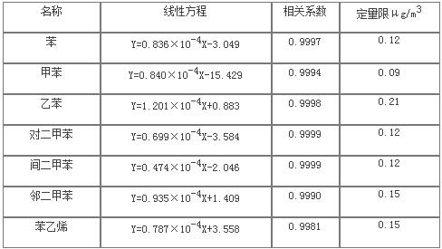 7種苯系物在進樣量1-320ng范圍內線性相關系數為0.9981-0.9999,線性關系良好。以響應信號為基線噪聲10倍時對應的進樣濃度作為定量限,確定物質的定量限均小于0.21μg/m3。