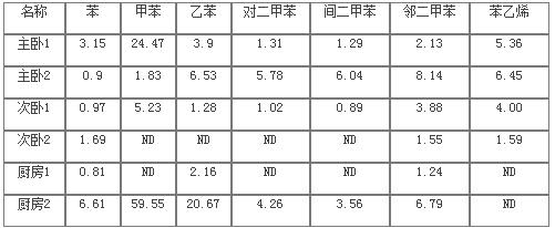 在剛裝修完的兩套住宅的三處不同地點進行取樣并分析7種苯系物的含量,測試結果見表7。