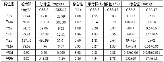 采用ICP-MS2000E電感耦合等離子體質(zhì)譜儀測(cè)定土壤標(biāo)準(zhǔn)物質(zhì)中Cr、Mn、Ni、Cu、Zn、Mo、Cd、Pb八種金屬元素含量,檢出限在2.85-117.76 ng/L之間,穩(wěn)定性在0.60%-3.68% 之間,各元素測(cè)試結(jié)果與標(biāo)準(zhǔn)值相符,能夠滿足第三次全國土壤普查中關(guān)于電感耦合等離子體質(zhì)譜法檢測(cè)上述各元素的要求。