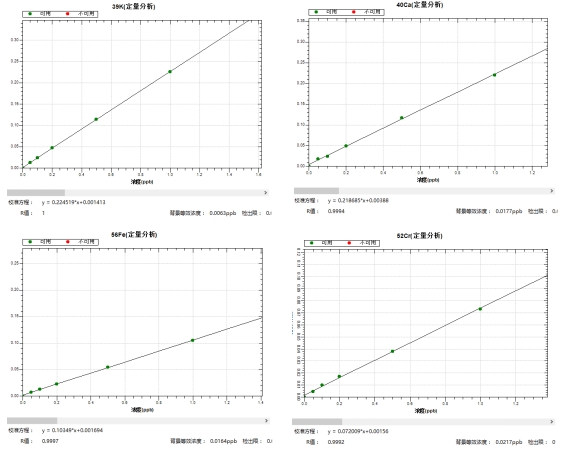 冷焰模式下,繪制各元素0,0.05,0.1,0.2,0.5,1.0μg/L系列濃度標液工作曲線,39K、40Ca、56Fe等同位素的線性相關系數r均大于0.999,背景等效濃度為0.0023μg/L~0.0217μg/L。