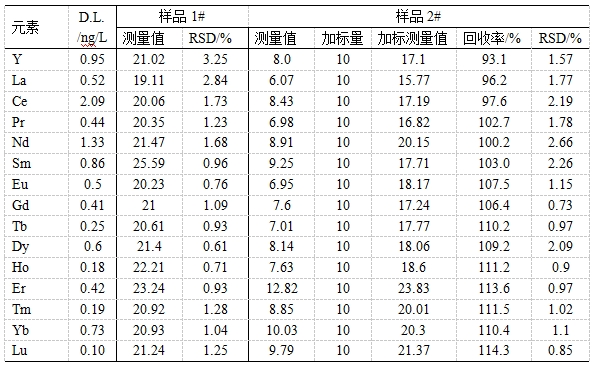 油田稀土示蹤劑主要用來考察油田井間的導通性,具有無放射性、安全穩定、用量少、分析精度高等特點。將所得油田水樣搖勻過濾,稀硝酸稀釋一定倍數,以內標法校正樣品基體對待測同位素影響,考察Y、La、Ce等15種稀土示蹤劑的檢出限、精密度(以RSD表示)、加標回收率。發現檢出限為0.10~2.09ng/L;樣品1#的精密度為0.61%~3.25%;樣品2#中各元素加標回收率為93.1%~114.3%,精密度為0.85%~2.66%。