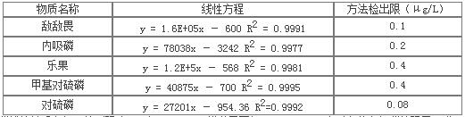 結果表明6種有機磷線性關系良好,檢測限為0.08~0.4μg/L,能滿足國標GB 3838-2002中對六種有機磷的限量要求。