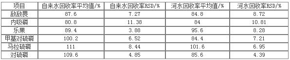在自來水和河水中加入0.5ug 6種有機磷混標,分別作三次平行樣,按處理樣品的方法進行樣品前處理,GC-MS 6800測試,采用外標法定量,計算其回收率,數據見下表:
